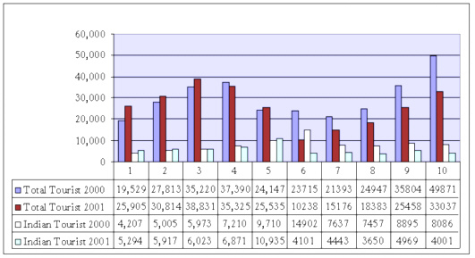 27.12.01 Es zeigt sich in Nepal keine große Änderung verglichen mit dem Anfang des Monates, welchen negativen Einfluss die Ereignisse auf die Touristanankünfte hatten, kann man an der