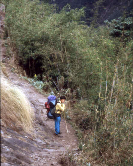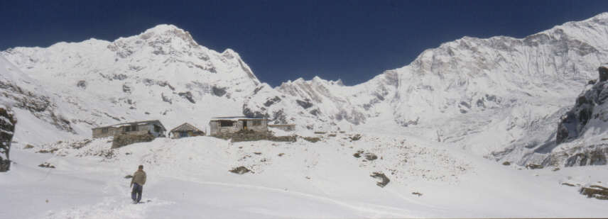 Die fast 4000 hohe senkrechte Wand Südwand der Annapurna 1. im Vordergrung sieht man den Gedenkstein an