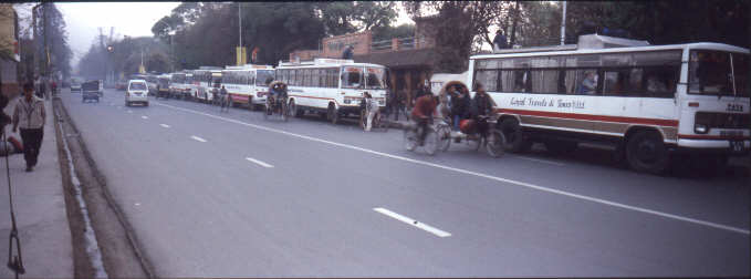 Frühmorgens im Nebel reiht sich Bus an Bus am Kantipath . Die Tickets hat man meistens direkt im Hotel kaufen können. Nun wird das ganze Gepäck auf das Dach gehievt und dann