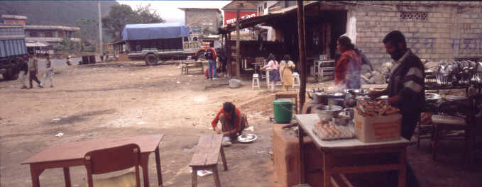 An den Strassendörfern wetteifern die Restaurants um Kunden. Die kleine nepalesischen Garküchen kochen auf selbstgebauten Lehmöfen und das Geschirr wird direkt an der