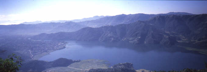 Von Sarangkot kann man Richtung südosten auf den See und Pokhara heruntergucken. Die lakeside befindet sich links im Bilde. Der weisse Punkt auf dem Hügel in der Bildmitte