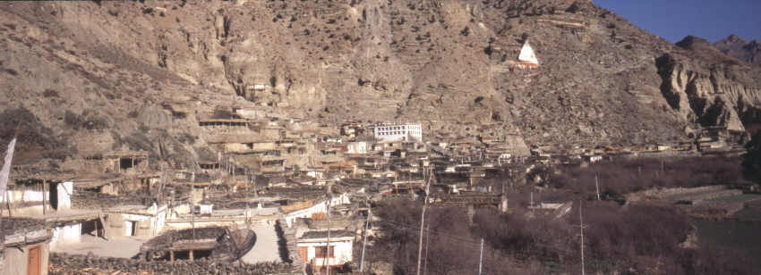 Marpha duckt sich in eine Seitenbucht des Kali Gandaki Tals und ist so einigermaßen vor dem Wind geschützt