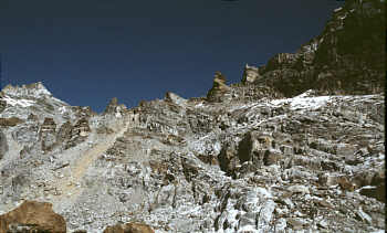Der Weg steigt steil im Geröllfeld rechts von der Schneerinne in der Mitte des Bildes hoch, bis man oben auf eine Art flache Aussichtsplattform kommt. Da das ganze sich schon auf 5000 m abspielt, kamen wir