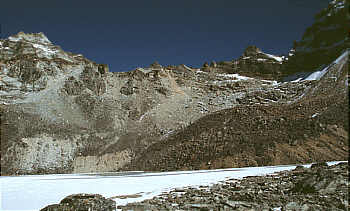 Deutlich sieht man auch hinter der grossen Seitenmoraene den Gokyo Gletscher.
