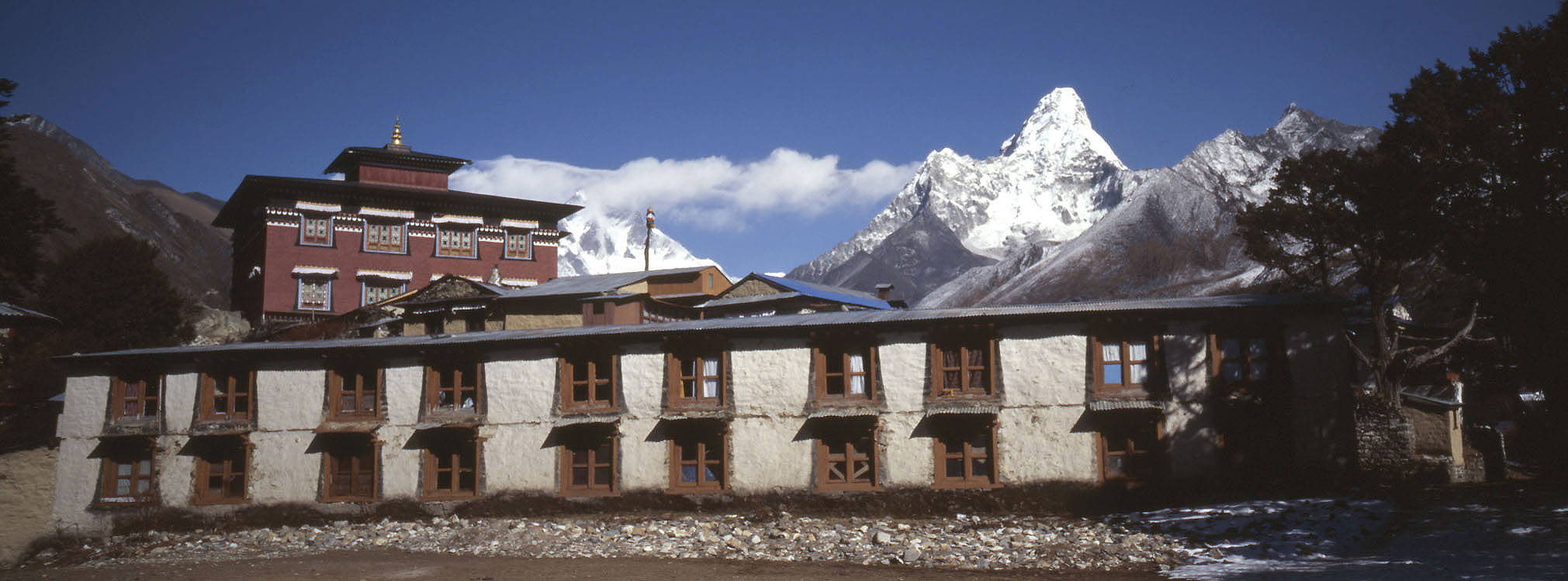 möchte, so lohnt es sich doch unbedingt, nach oben zu gehen. denn man hat eine besonders schöne Aussicht auf die Klostersiedlung und auf die Ama Dablam mit den romantischsten Einrahmungen dur