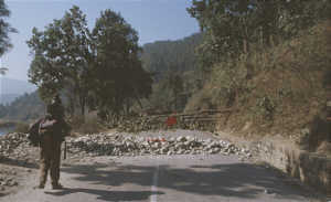 Die Maoisten hatten mehrere Transparente aufgehängt und denn Durchgang mit ein paar kleinen Bäumchen und Gestrüpp versperrt. Darüber hinaus lagen kleinen