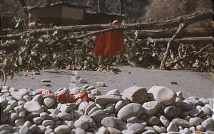 quer über die Straße gebaut. So putzig dass man es in 5 Minuten hätte wegräumen können. Wäre da nicht das kleine rote Tuch als Warnung von einer Bombe gewesen. Bachan und ich wussten sehr genau, dass
