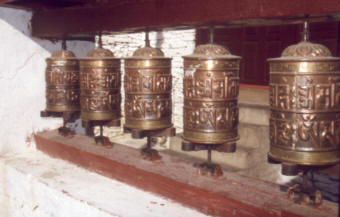 sind fein aufgerollt hunderte von mit Gebeten bedruckten Seiten. Wird nun die Gebetsmühle im Uhrzeigersinn gedreht, so werden sozusagen die Gebete freigesetzt. (Die Anhänger der Bon-Religion drehen sie entgegen dem Uhrzeigersinn). Die Gebetsmühle kann