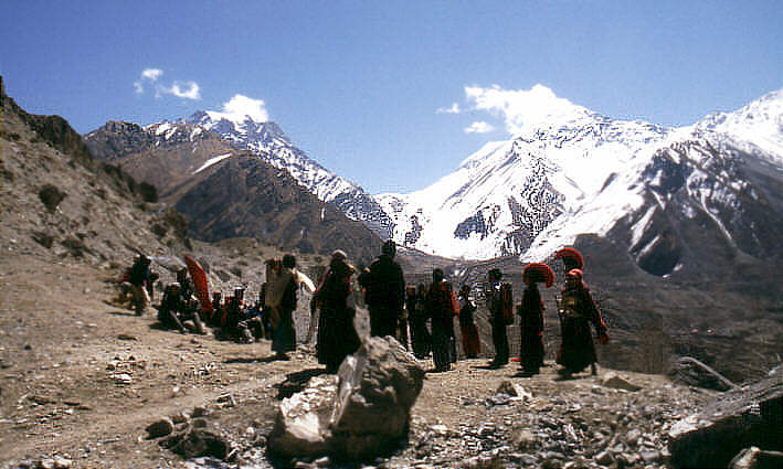 Die Prozession hält kurz an, im hintergrund sieht man den Thorong La