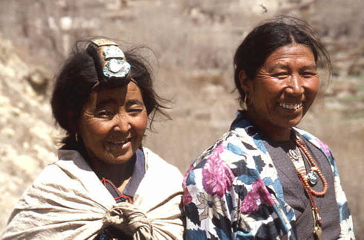 Die Frauen von Dzong beim gemeinsamen Beten, als ein hochrangiger Lama in das Dorf gekommen war.