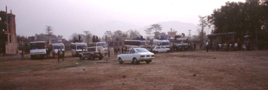 Frühmorgens im Nebel reiht sich Bus an Bus am Kantipath . Die Tickets hat man meistens direkt im Hotel kaufen