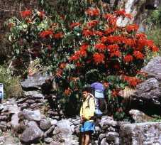 sie hier in Nepal bis zu 5 meter hoch und umrahmen mit ihren feuerroten Blüten manch schöne Bergsicht. Oft werden sie in Hecken zusammengepflanzt und leuchten schon auf Kilometer inmitten der grünen Felder. Im