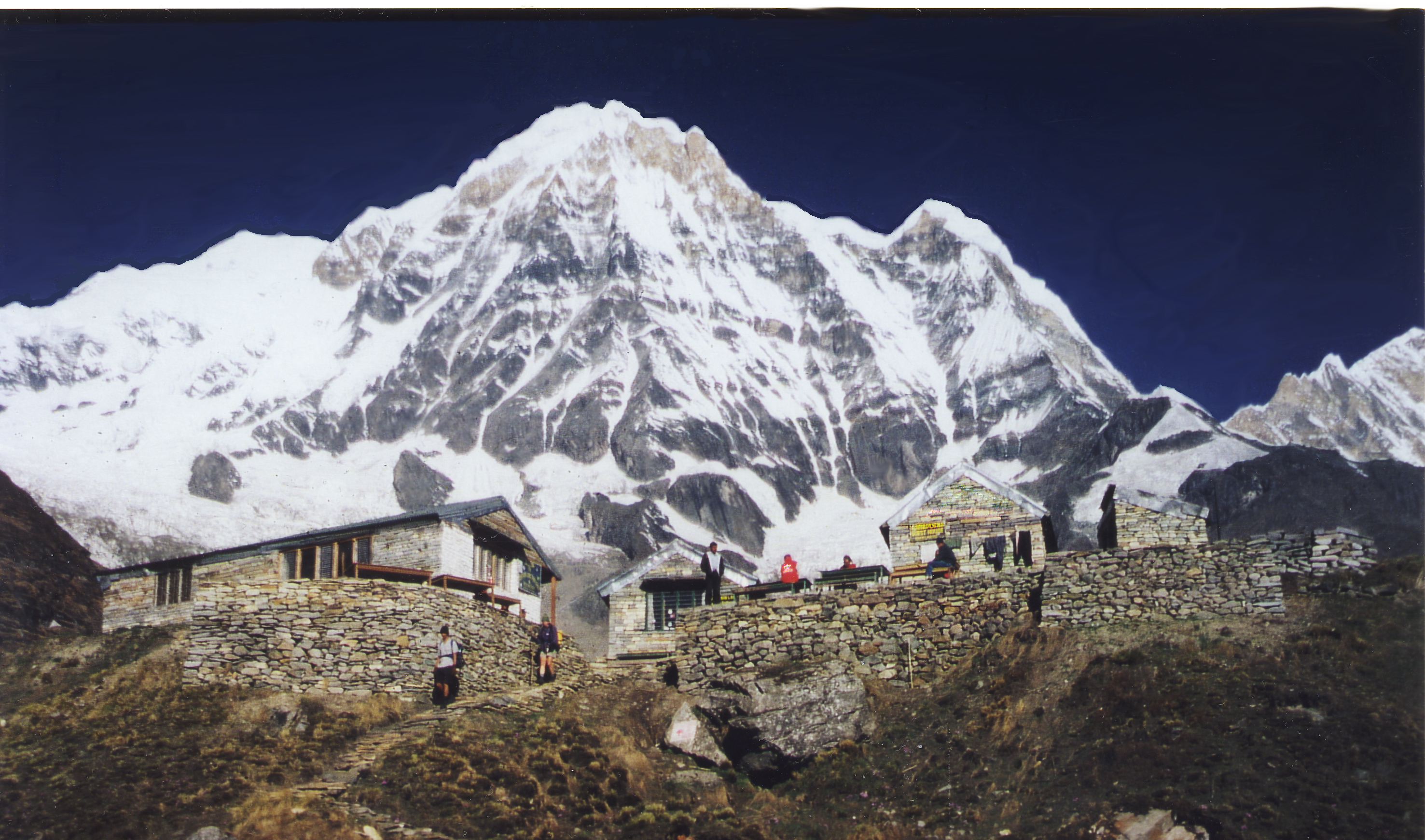 Bild vom Annapurna Base Camp auf 4000 m Höhe Im hintergrund die Annapurna Süd. Breite 25 cm bei 300 dpi