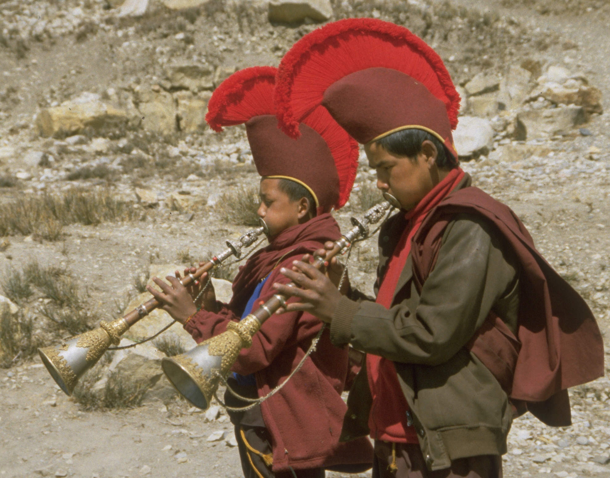 Zwei Möchen aus dem Kloster Dzong spielen während einer Prozession