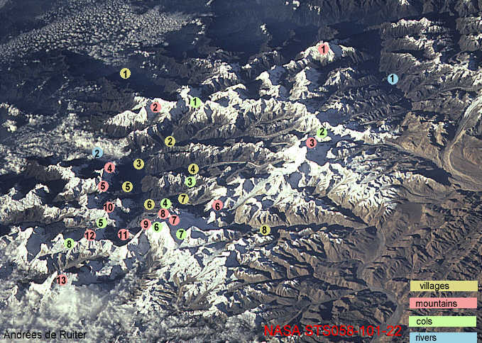 1 Gauri Shankar, 2 Numbur, 3 Cho Oyu, 4 Tramserku; 5 Kang taiga; 6 Pumo Ri; 7 Everest; 8 Nupse; 9 Lhotse; 10 Amai Dablang; 11 Imja Tse ( Island Peak); 12 Baruntse; 13 Makalu; 14 Mera Peak green-cols :