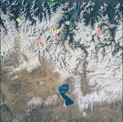yellow-villages: 1 Kodari,here is the boarder village on the main road to Tibet. 2 Nyalam . Langtang valley: 3 Kangjin gompa; 4 Langtang und am Trisuli 5