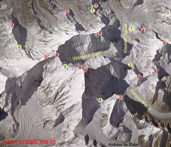 bei Peak 7583 m. Yellow :places: 1 Gorak shep; 2 EBC green: cols: 1 Kongma La 5535 m; 2 Imja Tse north col 5695 m; 3 Everest south col 7906 m; 4 Everest north col 7066 m