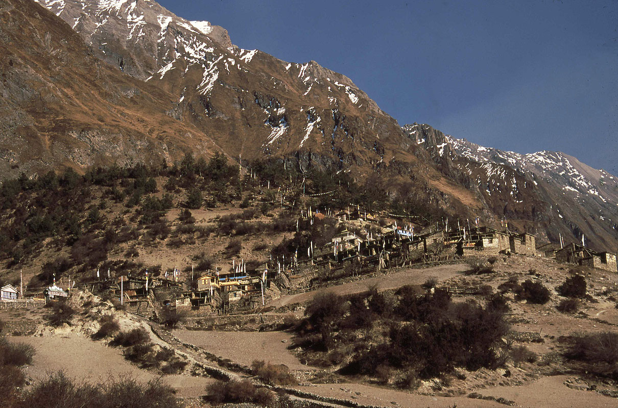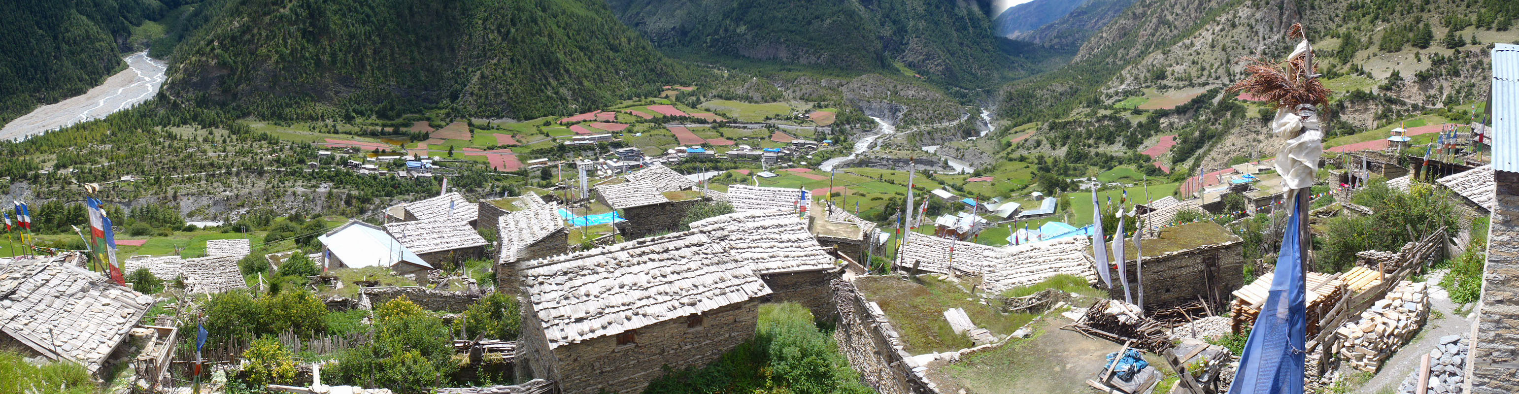 This old-style village is typical for the Manang area and has a large prayer wheel wall in the