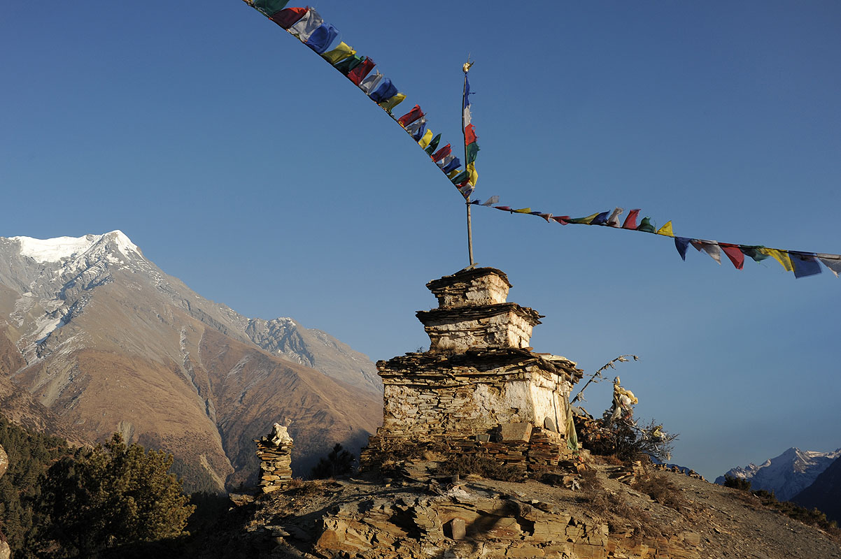Mani walls to reach a viewpoint with a big stupa and a beautiful view of Ghyaru and its many fields. A little further below you can see the ruins of Ghale Dzong, a fort