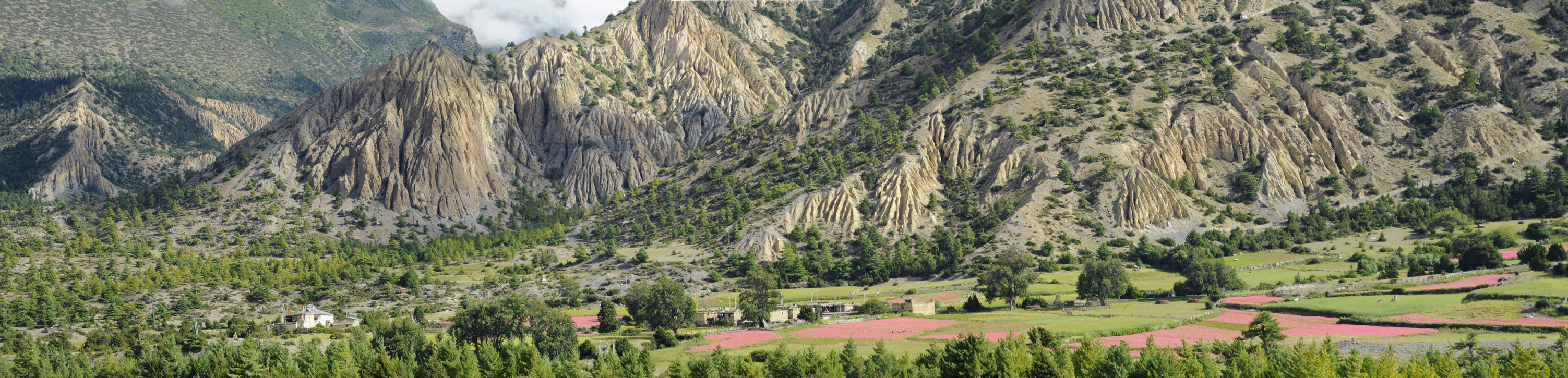 Leaving Julu you continue in the valley walking past fields , meadows or through pine trees. The terrain