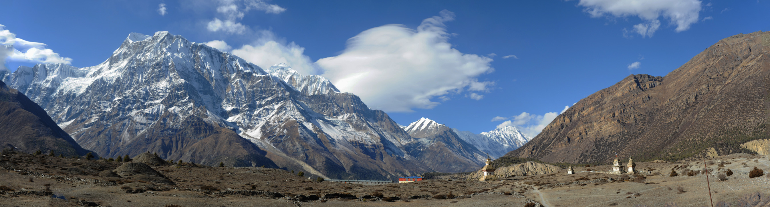 view into the Marsyangi valley from the tressa of the gompa. Annapurna 3, Gangapurna Khangsar Khang and a the end the Grande Barriere with Tilicho Peak