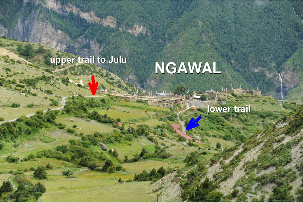 trails going from Ngawal to Braka (Braga).The lower trail desends directly to the Maryansyangi Valley while the upper one passes by the Lophelling Gompa and the little village of Julu