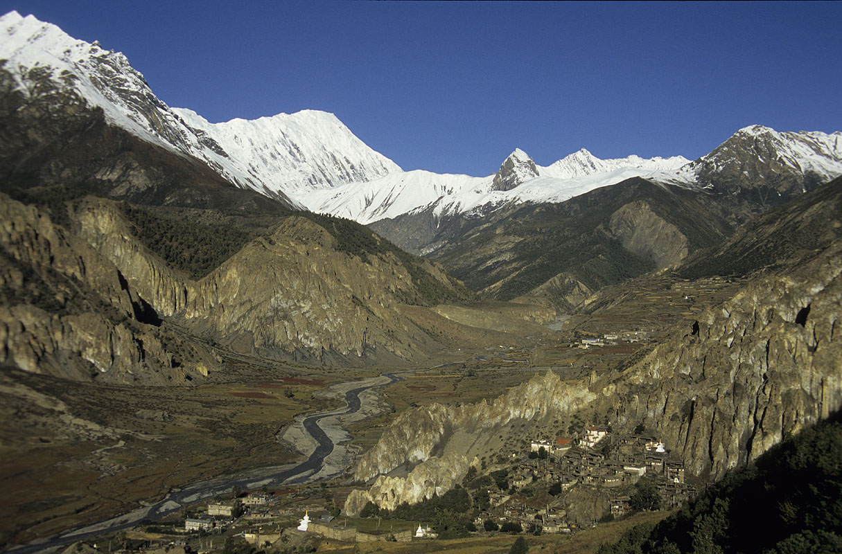 Manang is perched above cliffs. On the other side of the valley to the south there is the enormous mountain chain of the Annapurnas with Annapurna III and