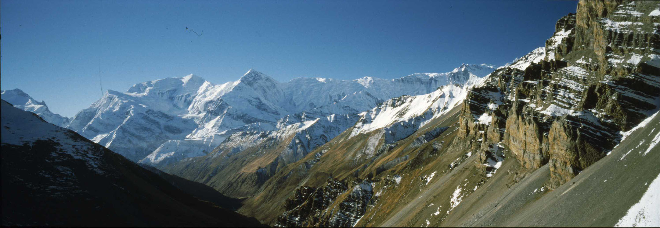 left/middle part Annapurna 3 and Gangapurna, the little black peak on th eright is roc noir aka Khangsar Khang. From it the ridge is continuing to Annapurna 1
