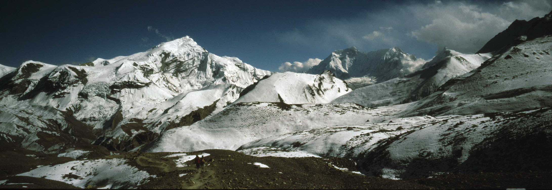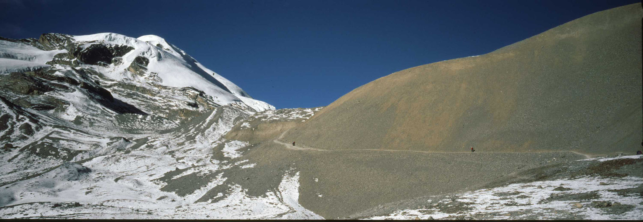 Thorong La seen from the West, on the left is Yakawa Kang and on the right Kathung Kang