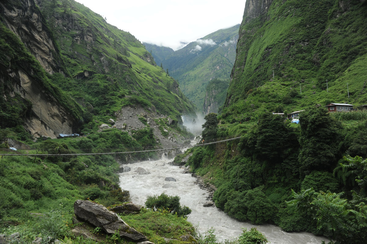 takes quite a while to continue on the road till you reach a smal suspension bridge leading to the few housesof Kabre. the NATT trail then continues again till dharapani on the left riverside. ( right on this photo)