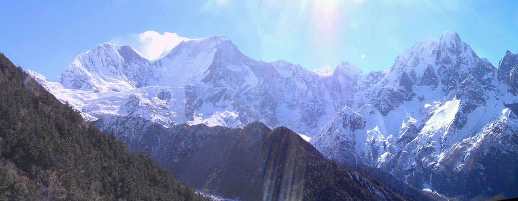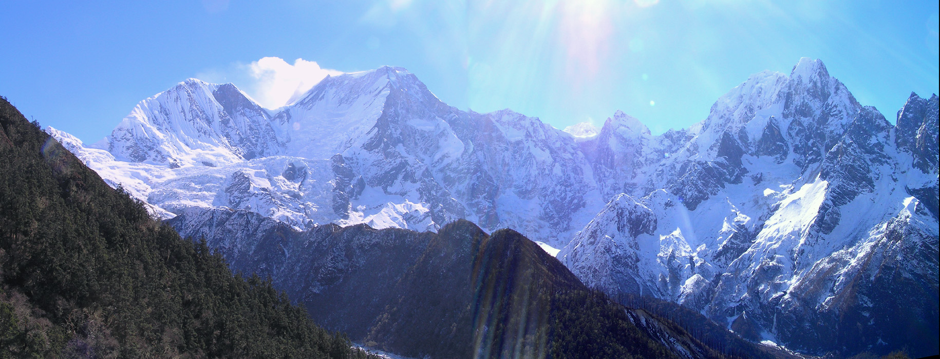 Manaslu panorama. Its the second mountain from the left. . XXL picture to scroll 1800x700 Pixel Suddently we where in a warm an smelling Pine forest.