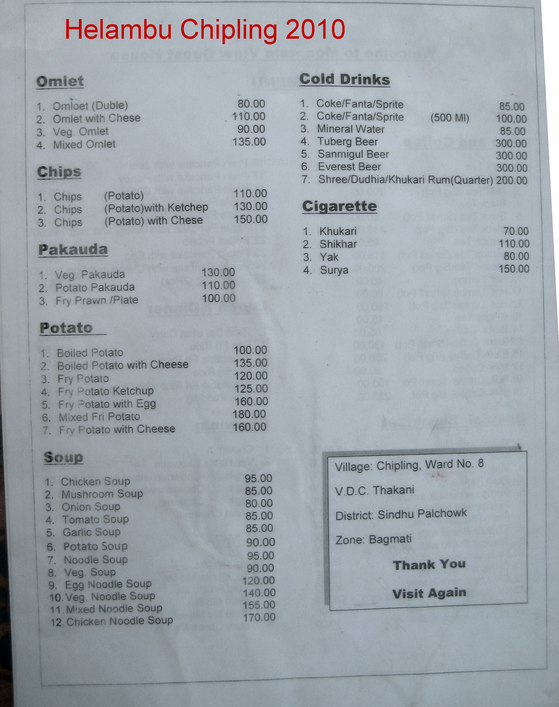 Preise im Helambu Gebiet / Food prizes in Helambu Area