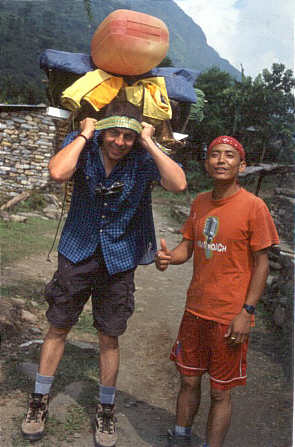 öfters im Annapurna- und im Everestgebiet mit Touristen unterwegs. Je nach Personenzahl arbeitet er allein als Porter/Guide, oder als Guide zusammen mit mehreren Porters.