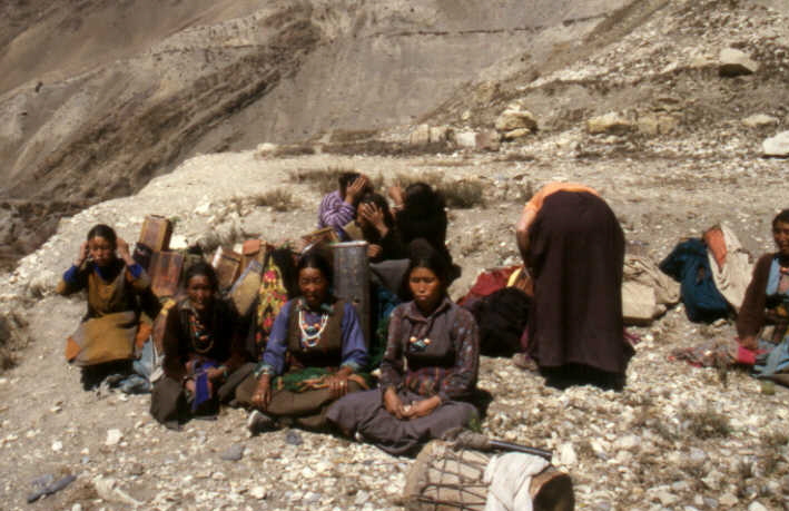 Die Frauen von Dzong beim gemeinsamen Beten, als ein hochrangiger Lama in das Dorf gekommen war.