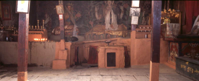 Der Tempel von innen, man sieht unter dem Altar die Vorhänge, hinter der sich die Flammen verbergen. Ebenfalls im kleinen Voraltar, dem Kasten in der Mitte des Bildes brennt eine Flamme.