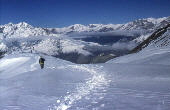 geschungenen Mulde der blaue Himmel strahlt. Doch aufgepasst: erst beim 14 . Mal ist es soweit! So schleicht und keucht man langsam den Pass hinauf, meist auf einem trockenen Geröllweg und ab und zu an Schneefeldern