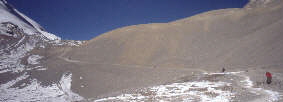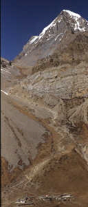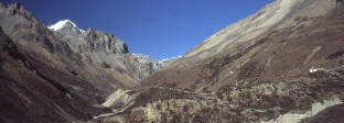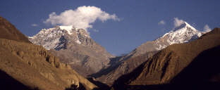 Bald sieht man dann zum ersten mal die Beiden Berge, zwischen denen der Thorong La liegt. Den Khatung Kang im Süden, und den Yakawa Khang im Norden. Im Herbst ist das Tal sehr trocken