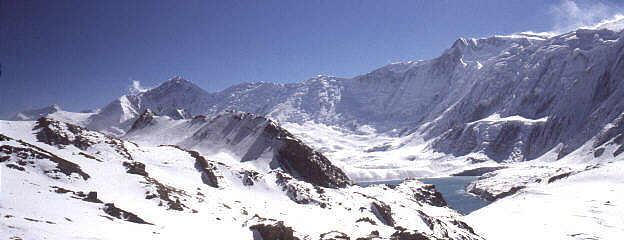 Blick vom Westufer nach Osten, man sieht die Grande Barriere, den Glacier Dome und die Gangapurna.