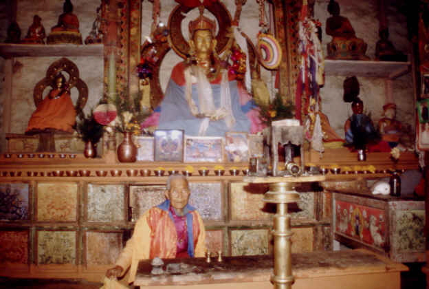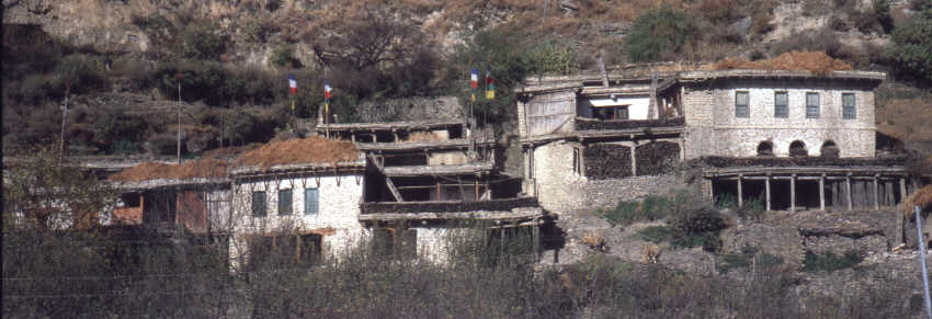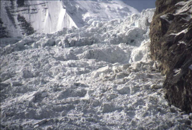 der Mitte gehört zum Baraha Shikar (auch Feng genannt), auf der rechten Bildseite ist die Annapurna Süd. Zwischen den zwei Gipfeln liegt ein riesiger Eispanzer.
