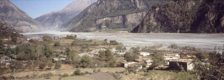 Blick vom Viewpoint auf die andere Talseite. Links das Nilgirimassiv mit den drei gipfeln, rechts davon die Annapurnagruppe