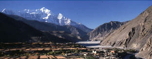 Nepal Reisebericht Trecking Rund um die Annapurnas, der Kali Gandaki, unteres Mustang: Kagbeni, Jomsom, Marpha, Tukuche, Larjung, Daulagiri Eisfall und Kalopani. Berge: Daulagiri, Nilgiri.