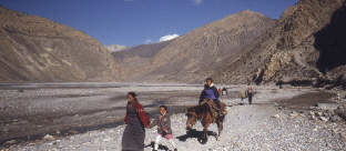Zwischen Kagbeni und Jomsom führt der Weg überwiegend im Flußbett des Kali Gandakis entlang. Dieser führt nur wärend des Monsums viel Wasser. Sehr unangenehm kann aber der Wind werden, der regelmässig